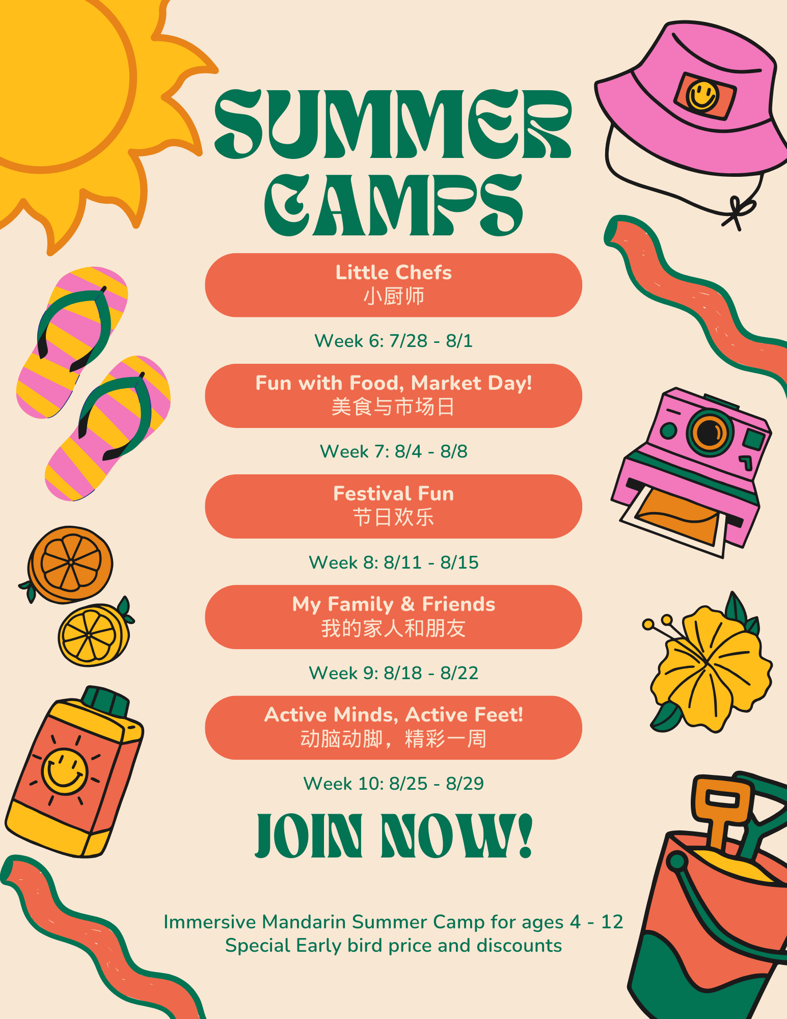 我们很高兴在 6 月 23 日至 8 月 29 日举办中文沉浸式主题夏令营。营地时间为早上 9 点至下午 5 点。地点在我们位于贝尔维尤的办公室,地址:2101 112th Ave NE Suite 100, Bellevue, WA 98004。更多信息,请点击此处。您可以在此链接注册: