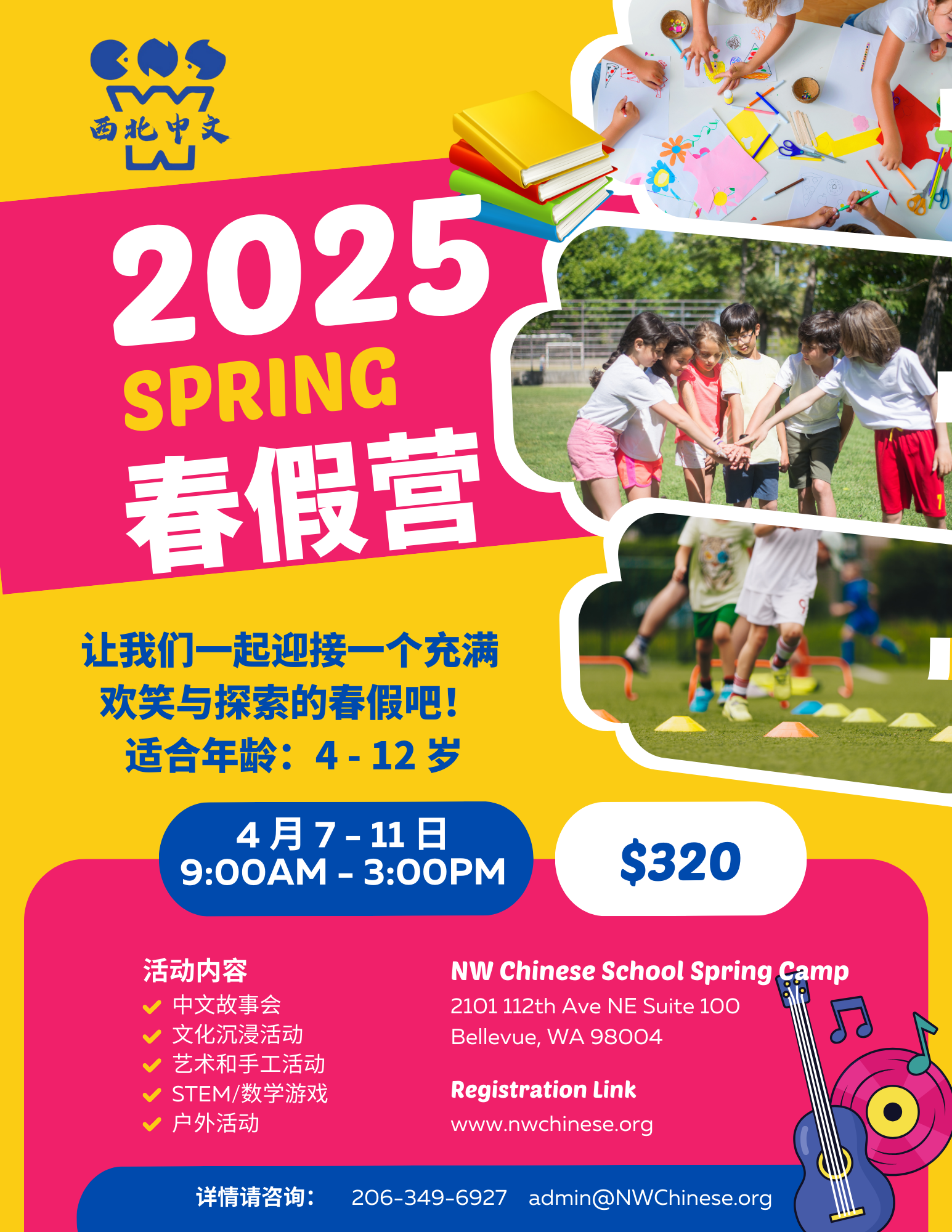 我们很高兴为即将到来的 4 月 7 日至 11 日的春假营举办中文沉浸式营地。营地时间为早上 9 点至下午 3 点,提供延长托管服务至下午 5 点。地点在我们位于贝尔维尤的办公室,地址:2101 112th Ave NE Suite 100, Bellevue, WA 98004。